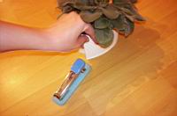 Speto stran obrnemo tako, da je zadaj. Vodo lahgko nalijemo tudi v podstavek, saj lahko lepenko privzdignemo.