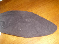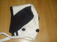 Na kapo prišijemo še trakove za zavezat in s pištolo za vroče lepljenje prilepimo kroge iz črnega flisa . Na sprednji strani prišijemo na kapo rob iz črnega flisa.