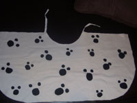 Nazadnje naredimo še ogrinjalo. Naše je veliko 50 cm x 90 cm. Na vsaki strani ga samo polkrožno odrežemo in na sredini naredimo polkrog za okoli vratu. Prišijete samo trak na vsaki strani za zavezat in na ogrinjalo nalepite kroge iz črnega flisa. Ogrinjala ni potrebno robiti, saj se flis ne bo scefral.
