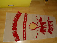 Za zgornji del potrebujemo flis velik 50 cm x 90 cm. Približno na sredini izrežemo luknjo za glavo. Potem na flis nalepimo resice, trikotnike, obrobo okrog vratu v rdeči barvi. Šivanje ali robljenje ni potrebno in ogrinjalo je res hitro končano.