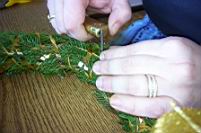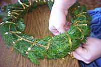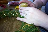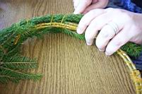 Na tako pripravljeni obod namestimo smrekove veje in jih nanj prav tako poveĹľemo z volno.