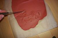 | Z valjarjem jo razvaljamo. Lahko jo damo med dva èasopisna ali kakšna druga papirja, da ne umažemo valjarja. V našem primeru smo uporabili kar papir za peko, ker èasopisni papir lahko pušèa barvne sledi. Razvaljamo jo tako tanko kot želimo. Mi smo jo razvaljali na približno debelino treh milimetrov. | ![]() |