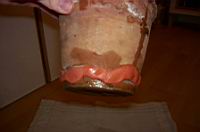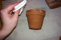 Na koncu vse skupaj zmoèimo (najbolje je, da uporabljate lepilo in v tem primeru lonca ne moèite). Ko smo konèali pustimo lonca kakšen dan (odvisno od debeline gline), da se glina na zraku poèasi posuši. |