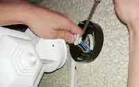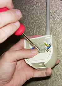 | Sedaj je na vrsti vezava kablov v podnožju svetilke. Kable najprej odrežemo na primerno dolžino in odstranimo zašèito. Zašèito posameznih žic odstranimo pri dovodnem kablu le z obeh enobarvnih (obièajno èrna in modra), na dvobarvni (zelenorumeni) pa zašèito pustimo, saj te žice ne bomo uporabljali (zemlje na vežemo, ker imata senzor in svetilka plastièno neprevodno ohišje). Poglejmo na shemo ki smo jo opisali tri korake nazaj in povežimo žice. Za povezavo èrnih žic bomo rabili eno sponko. | ![]() |