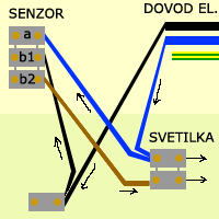 | V našem primeru je vezava izgledala takole: pri tem je b1 mišljen kot "vhodni" tok, ki ga senzor ob sprožitvi pošlje preko b2 ("izhodni") do luèi. Zemlje (dovod el.) v našem primeru ne vežemo nikamor, saj je ohišje svetilke in senzorja plastièno in to zato ni potrebno. Zemlje (zelenorumena žica) pri dovodu ne režemo, saj bi jo v ob menjavi svetilke s kovinsko morali zvezati na ohišje svetilke ! | ![]() |