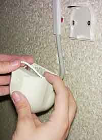 | Prva stvar, ki jo moramo storiti preden zaènemo z montažo senzorske luèi, je preveriti prisotnost elektriènega toka v dovodnem kablu. V kolikor je v kablu elektrika, moramo pred zaèetkom instalacije izklopiti/odviti varovalko, ki jo najdemo v razvodni omari. Varovalko odvijemo in jo vzamemo iz ležišèa. | ![]() |