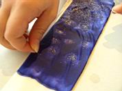 | Ko smo sol posuli na kravato z drugim èopièem, ki smo ga namoèili v vodo, na kravato nakapljamo nekaj kapljic vode. Paziti moramo, da se barva ne posuši preden jo posujemo s soljo in zmoèimo z vodo ! | ![]() |