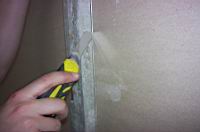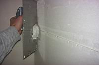 | Plošèe zaènemo polagati od zida. Na dveh krajih so plošèe nekoliko tanjše. To je mesto za bandažirni trak (mrežasti samolepilni trak za fugiranje mavènih plošè). Plošèo pritrdimo z vijaki na nosilce v razmaku od 15-20 cm. Pazimo, da smo vijak dovolj privili. Naj bo nekoliko vgreznjen, saj ga bomo lažje zafugirali. Vijaèimo vedno navpièno. | ![]() |