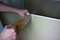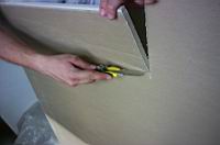 | Mavèno plošèo režemo enostavno s tapetniškim nožem. Ko jo izmerimo in zarišemo, si pomagamo z ALU letvijo in zarazimo eno stran plošèe. Z nožem lahko potegnemo veèkrat, da popolnoma prerežemo karton. | ![]() |