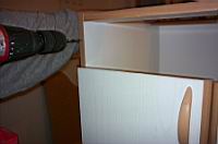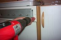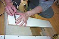 Na vrata ponovno namestimo robni trak. Trak namestimo tudi na novo odrezano iverno plošèo za upravljalni del.