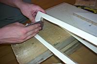| Ker je naš šank izdelan na enem koncu v loku, bomo morali nekoliko prirezati zadnjo stran pulta. Zato si zarišemo s svinènikom del, ki ga bomo odrezali. Èe niste preprièani koliko odrezati, raje režite postopno ali prej izdelajte iz kartona model (kot smo mi storili spodaj). | ![]() |