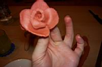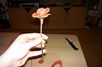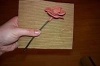 | Cvet vrtnice posadimo na steblo. Za stebo lahko uporabite tanko palico ali steblo kakšne druge cvetlice, mi smo uporabili posušeno steblo vrtnice. | ![]() |